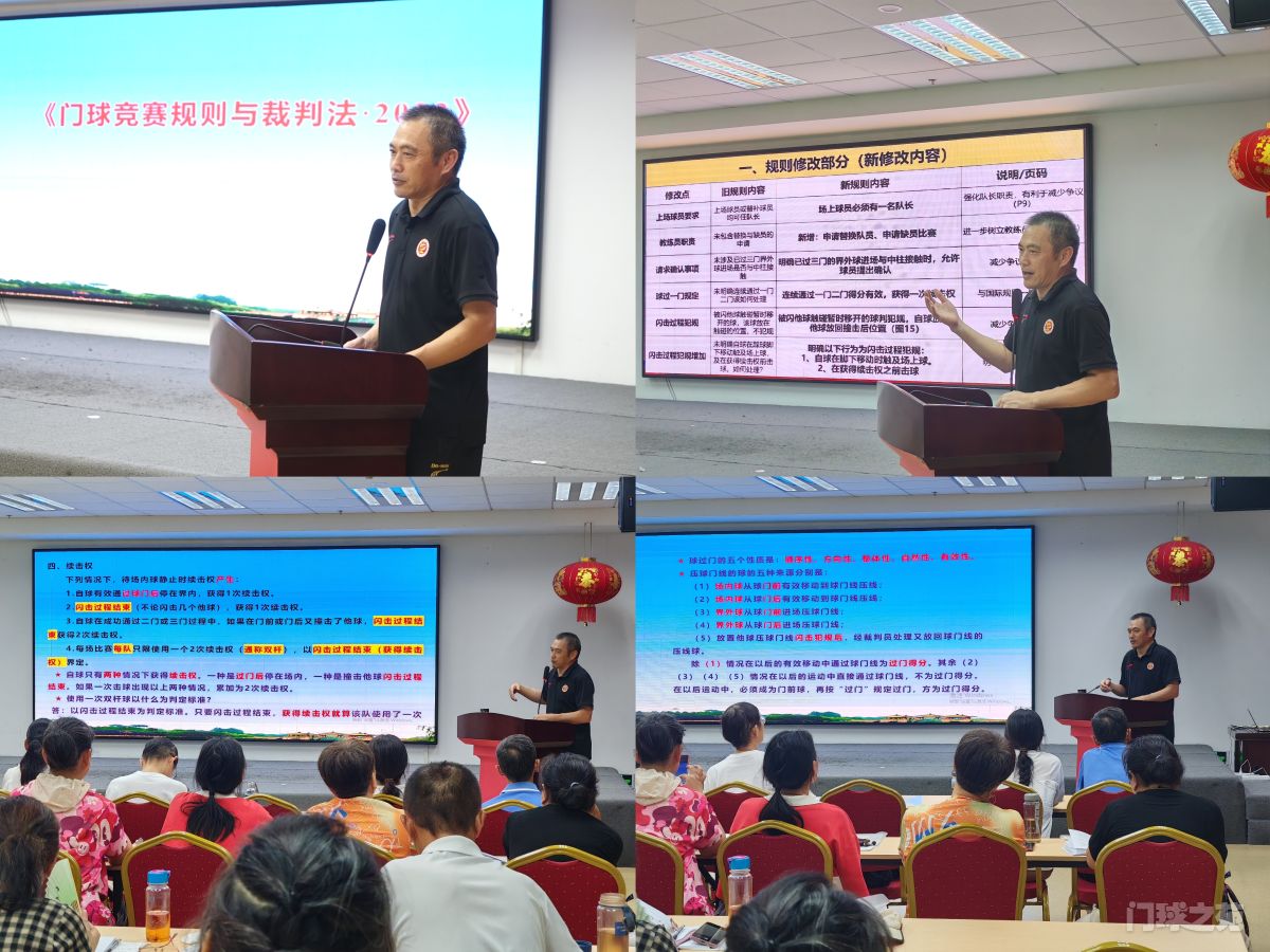随后,陈耀忠老师对《2023门球竞赛规则与裁判法》进行了生动、详实的讲解。他将新规则中的调整内容或修改点、旧规则内容、新规则内容、说明/页码列成表格,并将条目中的重点字词用彩色字标明,让大家都能一目了然地看到新规则与旧规则的不同之处。在讲课中,他还结合门球比赛实例,对执裁中容易出错的地方结合新规则进行了分析、讲解。