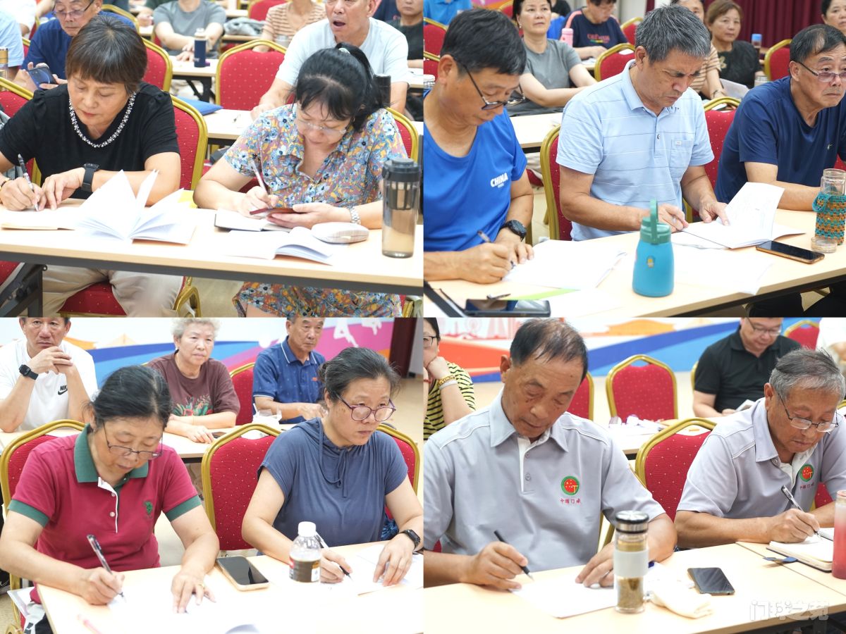 学员们答题时,有的边审题边回忆着昨天陈老师讲课时学习到的新知识,逐题认真做着;有的不时翻一下《2023门球竞赛规则与裁判法》,核对一下自己写的答案是否符合书上的规则;有的轻声和身旁的人交流一下,看二人的答题是否一致……。