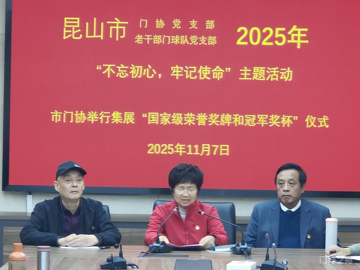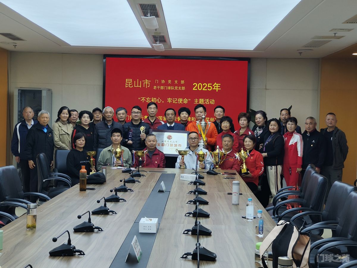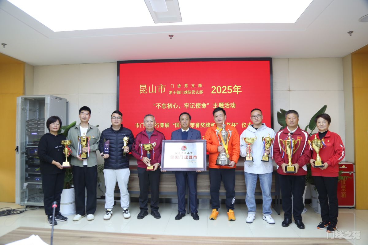 活动现场还举行了国家级荣誉奖牌和冠军奖杯捐赠仪式,获奖代表将“全国门球城市”牌匾及十座全国冠军奖杯赠予市门协荣誉室,市门协会长顾小锦郑重接过荣誉并与代表们合影。顾小锦会长对昆山门球的辉煌成就表示祝贺,承诺后续将整合资源助力昆山门球高质量发展,勉励全体党员和嘉宾锚定新目标、勇建新功绩。