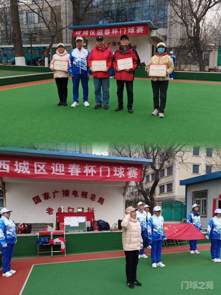 来自西城区8支门球队,分为两个小组进行了预赛,出线的4个队进入复决赛。经过一天时间紧张激烈的比拼后,裁判长宣布比赛结果:第一名广外红莲队,第二名京西华盛队,并列第三名广电局二队与财政部队。西城区门协会长杨玉岭为优胜队颁发了奖状并合影留念。